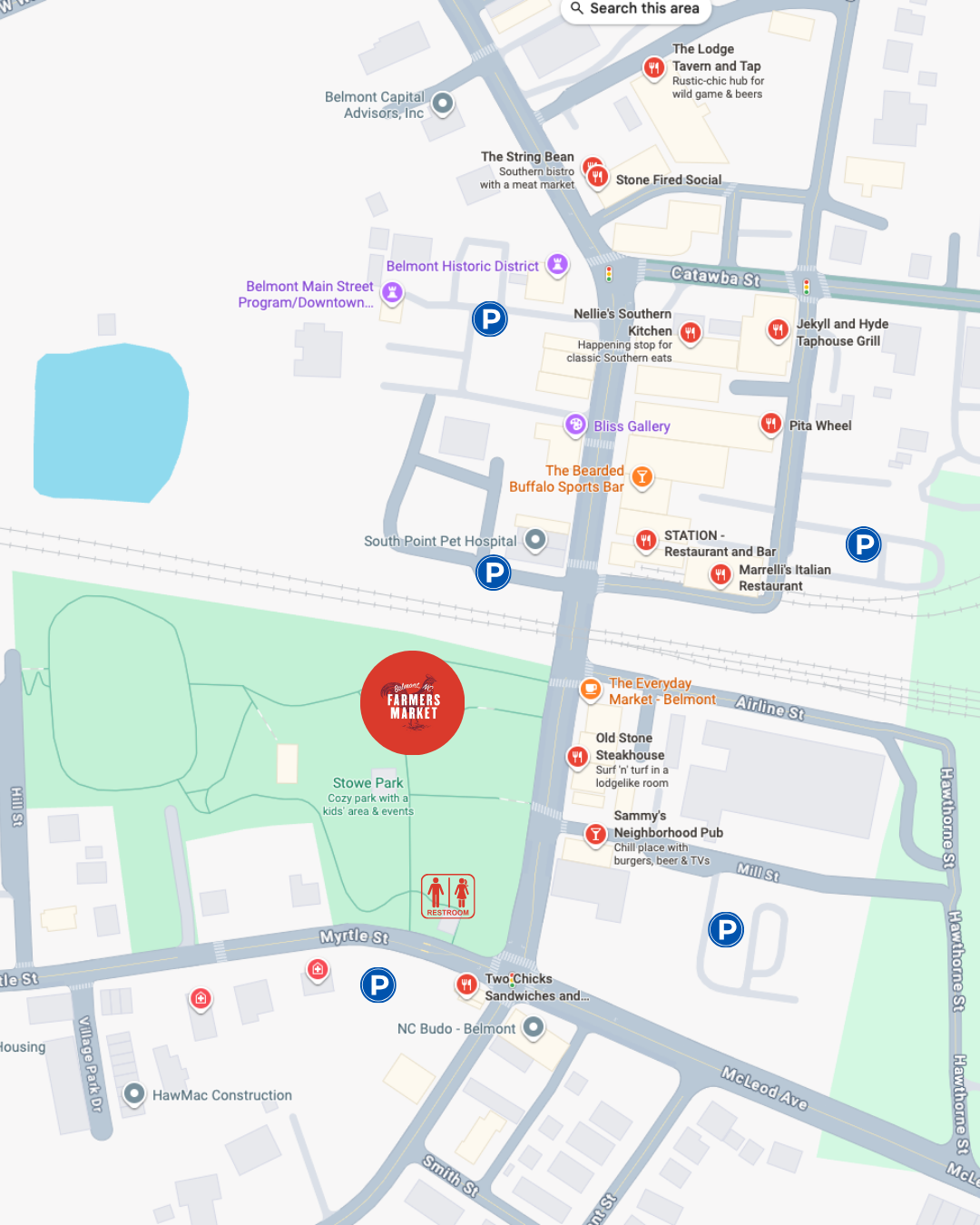 Parking around the Belmont, NC Farmers Market is simple—there’s convenient street parking up and down S. Main Street, along with several public lots throughout downtown. The map below can help you find the best spot before you head over.